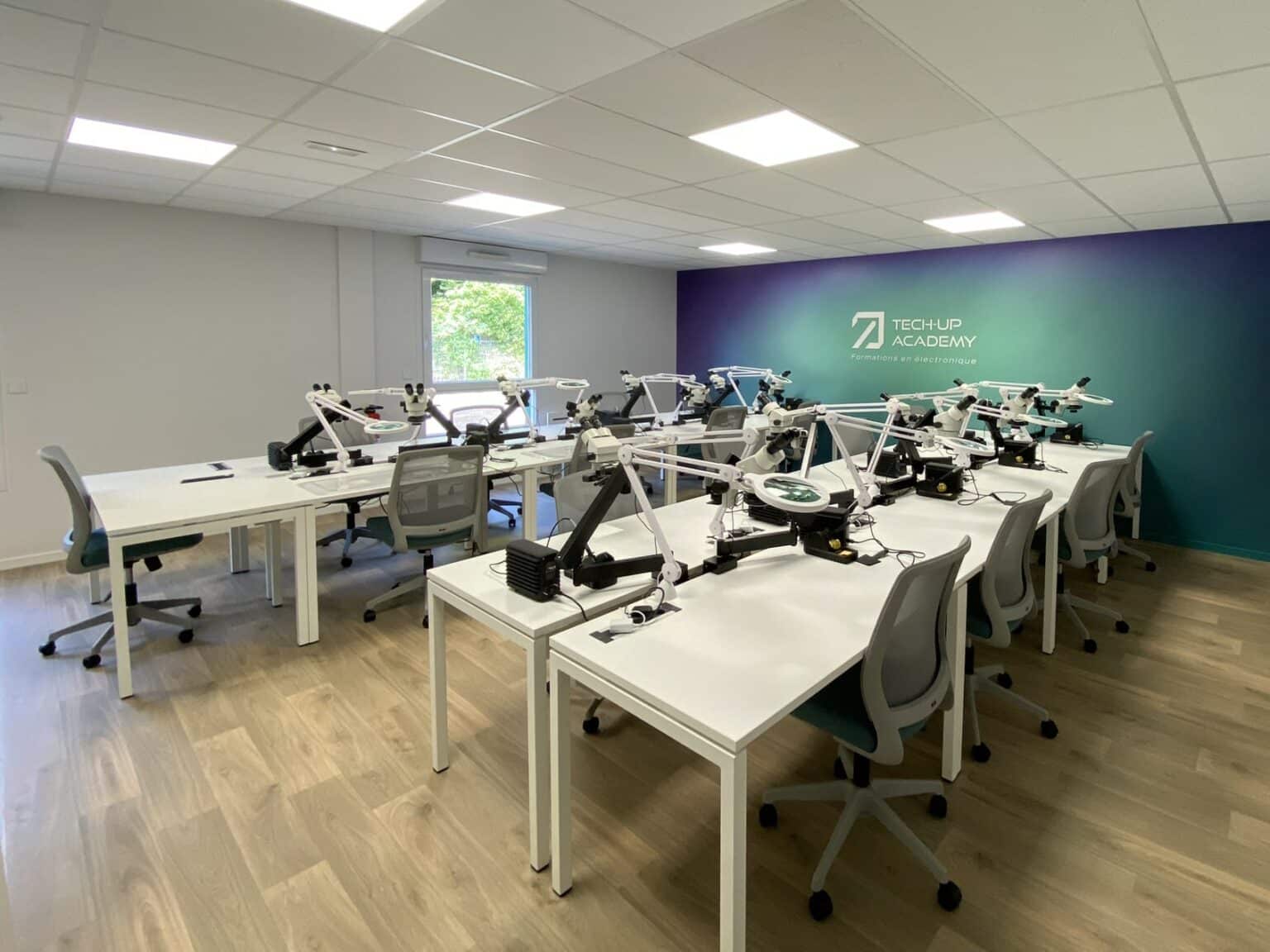 - Postes de travail individuels équipés de matériel professionnel (binoculaires, fers à braser…)