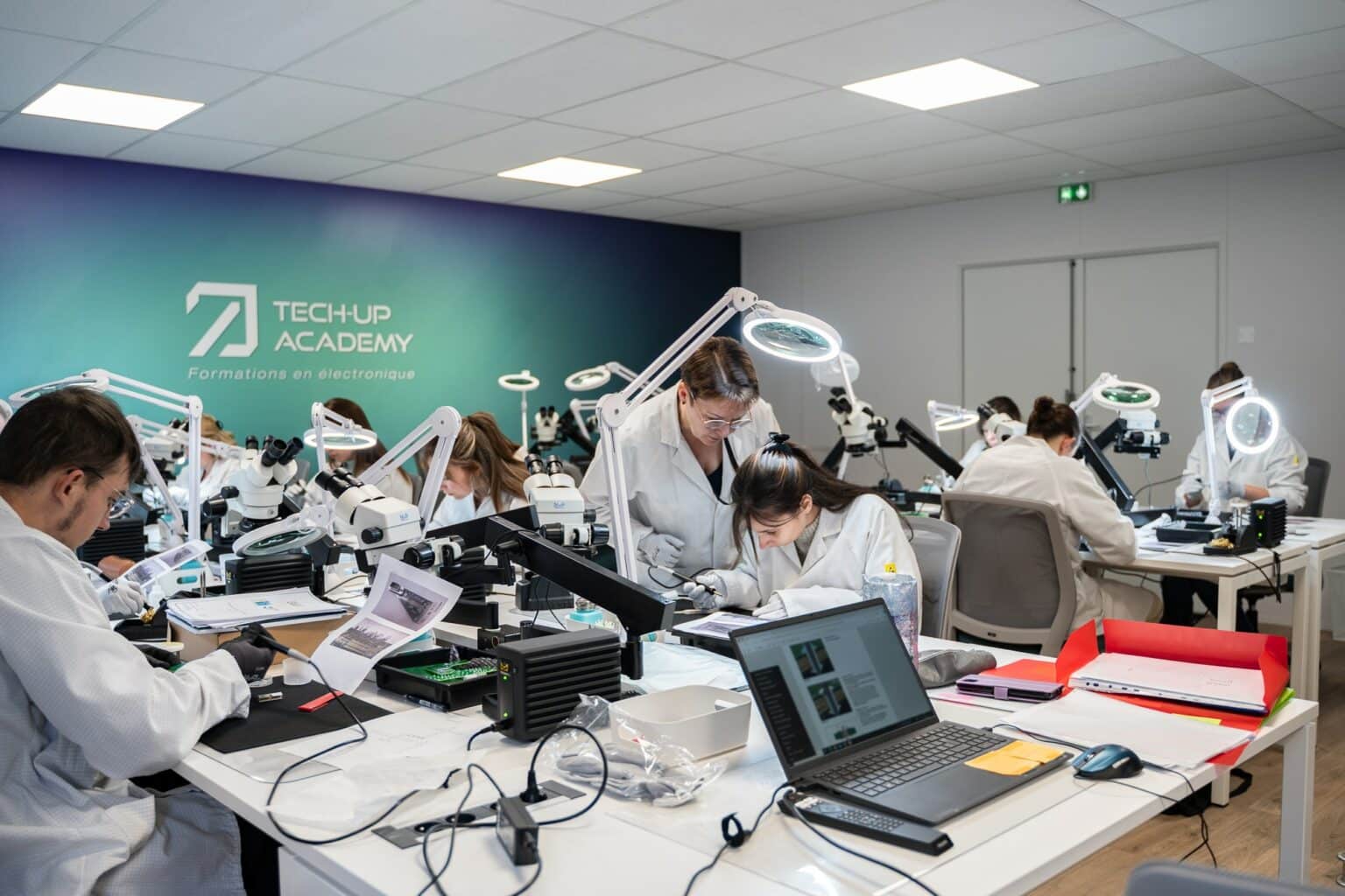 Se former à la Tech-Up Academy, c’est acquérir des compétences concrètes en immersion dans un environnement industriel. Nos formations, alliant théorie et pratique, sont conçues pour répondre aux besoins réels du secteur et préparer efficacement aux métiers de l’électronique. Chaque parcours permet de s’exercer sur du matériel professionnel, dans des conditions proches du terrain, pour acquérir des compétences immédiatement mobilisables dans le monde professionnel.